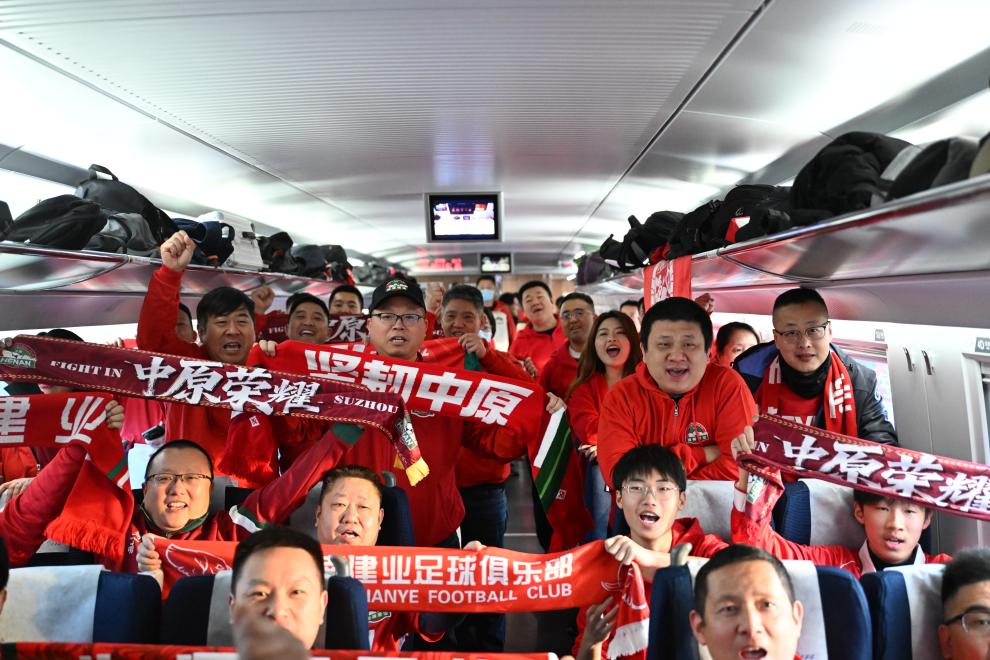 12月6日,河南队球迷乘坐球迷专列前往比赛举办地苏州。新华社记者 李嘉南 摄